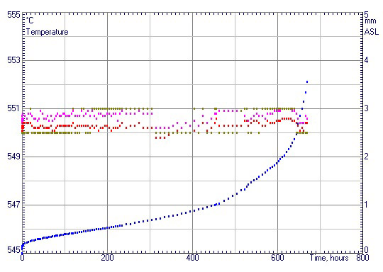 The creep testing software and hardware package scans each test machine regularly to read thermocouples, extensometers and crack growth voltages if available; store them on a logarithmic time scale; check test start and termination activities. The test types available are stress rupture test, creep strain test and creep crack growth.