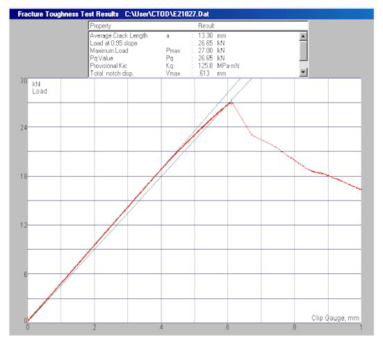 After the test is finished, the modulus of elasticity is drawn. Depending on the test requirements, either the 5% secant line is drawn to calculate the fracture toughness (KIc), or the parallel offset at Pmax is drawn to give the critical crack tip opening displacement (CTOD) or the area under the curve is calculated to yield the critical J fracture toughness, or any combination.