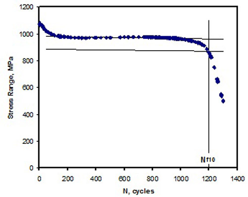End of TMF life is defined as the point at which the maximum stress σmax or stress range Δσ decreases by user-defined level, e.g. 10% below a tangent line drawn to the curve of σmax or Δσ versus N in linear scaling; or total separation of the test piece.